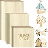 Realure 15 Pcs/3 Sizes Plywood Sheets Set, 10x10/15/20x0.2cm Balsa Wood Sheets, Thin Unfinished Bass...